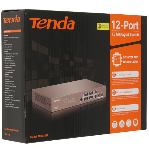 Коммутатор Tenda TEG5312F – управляемый коммутатор Tenda третьего уровня. Для обеспечения высокопроизводительного доступа коммутатор оснащен 10 портами Base-T Ethernet 10/100/1000 Мбит/с и 2 отдельными портами Base-X SFP 1000 Мбит/с. Благодаря инновационной аппаратной структуре и программной платформе, он обладает высокой вычислительной мощностью и комплексным механизмом защиты, что упрощает управление и обслуживание, полностью удовлетворяя требованиям к доступу с высокой плотностью пользователей и высокопроизводительной агрегации. Идеально подходит для уровня агрегации или уровня ядра сетей среднего и крупного размера, таких как корпоративные сети и кампусы.