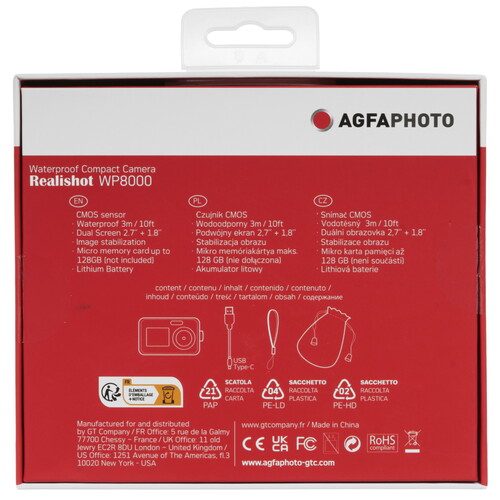 Компактный фотоаппарат AgfaPhoto Realyshot WP8000 – модель в голубом корпусе с 24-мегапиксельной матрицей, которая обеспечит ведение фотосъемки в максимальном разрешении до 8000x6000 пикселей и съемку детализированных видеороликов длительностью до 29 минут в разрешении 2.7К. Автономную работу устройства обеспечивает аккумулятор емкостью 650 мАч, заряд которого экономится благодаря функции автоотключения. Для записи звука в моно-формате при съемке видеороликов предусмотрен встроенный микрофон.