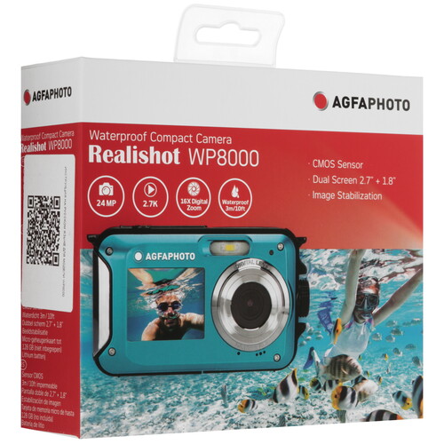Компактный фотоаппарат AgfaPhoto Realyshot WP8000 подойдет для подводной съемки за счет водонепроницаемой конструкции, благодаря которой он выдерживает погружение на глубину до 3 метров. Модель предусматривает передний экран с диагональю 1.8\
