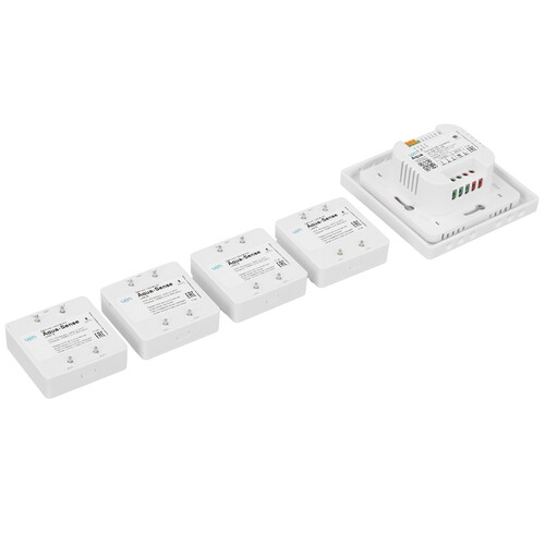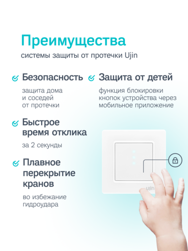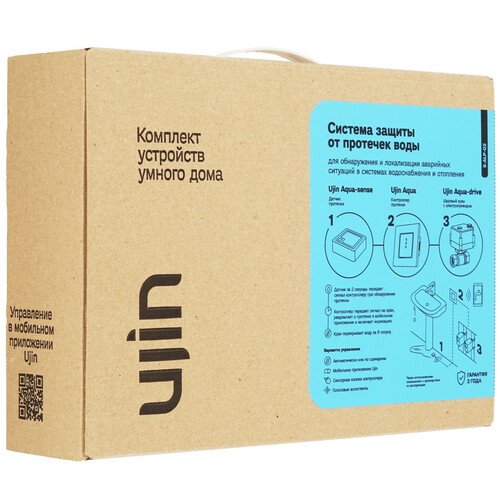 Предназначен для обнаружения и локализации аварийных ситуаций в системах водоснабжения и отопления. Комплект состоит из контроллера протечки Ujin Aqua, четырех беспроводных датчиков протечки Ujin Aqua-sense и двух шаровых кранов с электроприводом Ujin Aqua-drive.