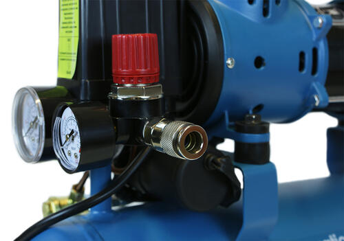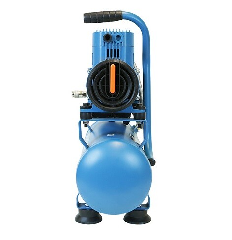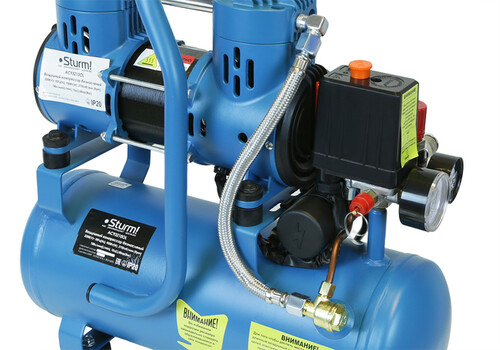 Безмасляный компрессор с 2-х цилиндровым мотором с пониженным уровнем шума, с увеличенным количеством оборотов 2750 об/мин, с двумя шлангами для нагнетания давления обеспечивает поднятие давления в 10-ти литровом ресивере с 0 до 8 атмосфер за 1 минуту;