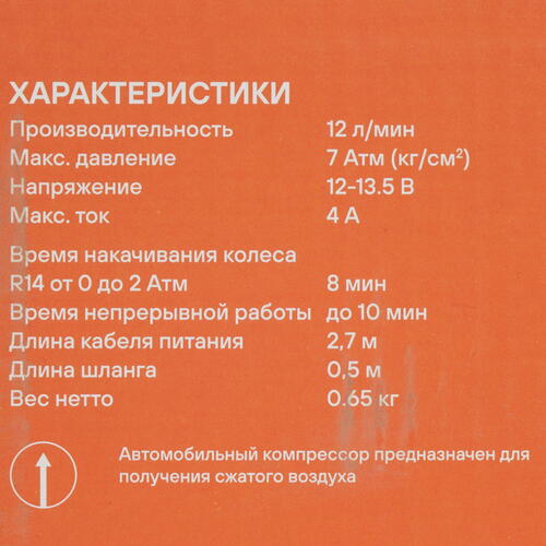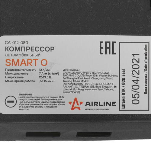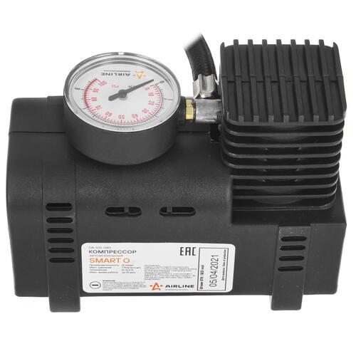 AIRLINE SMART O для своих компактных размеров качает со скоростью 12л/минуту. Максимум давления - 7 атм, он достигается в течении 15 минут безостановочной работы. Электрическое питание от машинного прикуривателя потребляет всего 4 А тока, поступает через шнур в 3 метра длиной. 2 насадки-переходника дадут возможность пользоваться компрессором для шин в любой марке автосредства.
