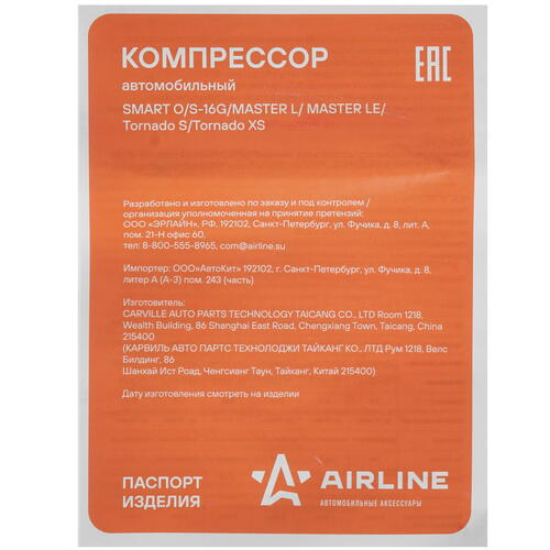 Один из компактных компрессоров для наполнения шин колес автотранспорта давлением - это компрессор для шин AIRLINE SMART O. Небольшой оранжевый корпус изготовлен из прочного пластика, вес составляет всего 0.50 кг. На корпусе есть большой манометр, на котором отслеживается нужный уровень давления. В достаточно миниатюрном устройстве имеет отсек для отдельного хранения проводов и шланга.