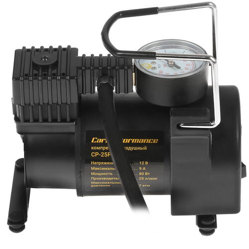 Автокомпрессор AUTOPROFI CP-25P оснащен кабелем питания длиной 2.8 м и съемным воздушным шлангом 60 см с латунным штуцером. Следить за давлением поможет аналоговый манометр на корпусе со шкалами KPA, BAR (кг/см²). Конструкция дополнена прочной амортизационной опорой.