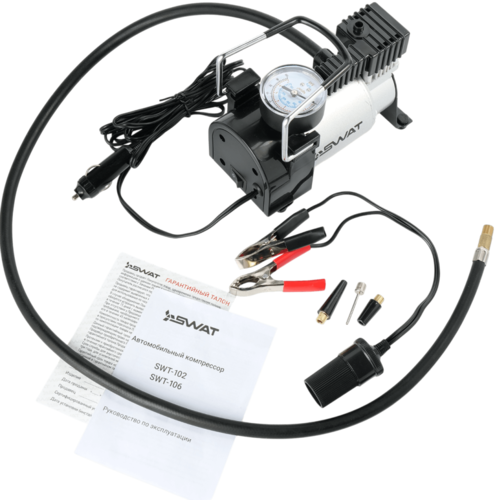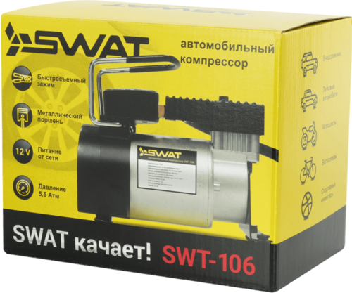 Автокомпрессор Swat SWT-106 идеально подходит для автомобилей, велосипедов, спортивных мячей, надувных лодок, матрасов и надувных бассейнов.
