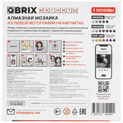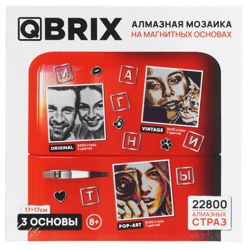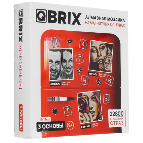 Конструктор Mozabrick Qbrix на магнитах включает сразу три набора страз на магнитной основе для сборки изображений и фотографий по инструкции из приложения. Используя аксессуары из комплектов, вы сможете собирать изображения по фотографиям размером 17х17 см практически на любых металлических поверхностях.