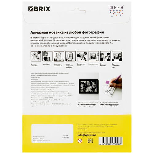 Конструктор Qbrix ORIGINAL Алмазная представляет собой алмазную мозаику, при помощи которой можно собрать любую фотографию. Если вы отдаете предпочтение кропотливым хобби, то данная модель – это именно то, что вам нужно. С этим набором вас ожидают часы настоящего творчества. Такой фото-конструктор станет оригинальным презентом на любое торжество, который надолго запомнит не только именинник, но и все остальные гости. Вовлечь в создание картины из кристаллов можно не только взрослых, но и детей в возрасте до 8 лет.