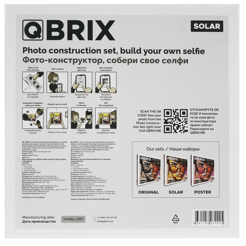 Конструктор Qbrix SOLAR – отличный выбор для людей, желающих провести время не только с удовольствием, но и с пользой. Набор, основу которого составляют 3500 пластиковых деталей, позволяет собрать пиксельную «картину» из фотографии. Картину затем можно разместить в комплектной коробке-фоторамке. Фоторамка подходит для размещения на стене. Сборка конструктора проста: после загрузки фото на сайт с помощью мобильного приложения пользователь получает инструкцию.