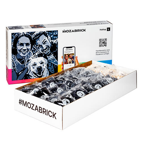 Набор MOZABRICK Набор L – фотоконструктор, который можно собирать неограниченное количество раз. Примерное время сборки – 18 ч. Конструктор позволяет превратить любую фотографию в черно-белое изображение в стиле «пиксель-арт». Получившуюся «картину», имеющую размеры 76x76 см, затем ничто не мешает использовать для украшения интерьера дома или квартиры. Сборка не представляет сложностей: после загрузки фотографии на сайт вы получаете подробную инструкцию.