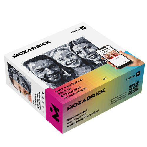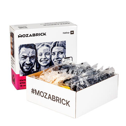 Набор MOZABRICK Набор M – отличный выбор для любителей семейного досуга. Это фотоконструктор, который можно собирать вдвоем или вместе с детьми. Набор позволяет превратить любую фотографию в черно-белое изображение в стиле «пиксель-арт». «Картину», имеющую размеры 51x76 см, затем можно использовать для украшения интерьера.