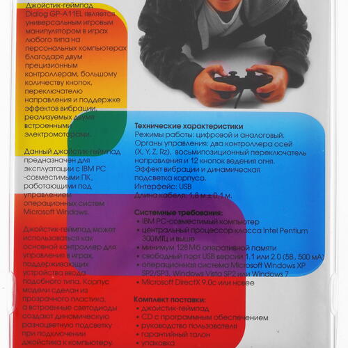 Геймпад Dialog GP-A11EL подключается к компьютеру при помощи USB-кабеля длиной 1.8 м, что обеспечивает свободу движений во время игрового процесса. Его питание осуществляется по шине, поэтому отвлекаться на подзарядку не придется. Данный геймпад является универсальным манипулятором в играх любого типа. Модель оснащена динамической трехцветной подсветкой корпуса: LED-огоньки срабатывают при подключении контроллера к ПК и реагируют на определенные события.