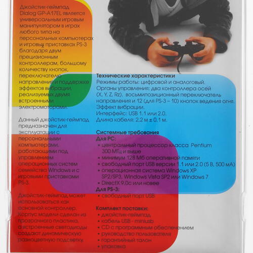 Геймпад Dialog GP-A17EL полностью совместим с платформой PlayStation 3, а также подходит для использования с ПК на Windows и может использоваться как основной контроллер. Подключение осуществляется с помощью отсоединяемого кабеля USB длиной 2.2 м. Благодаря эргономичной форме джойстик комфортно лежит в ладони, а специальное покрытие Grip Surface исключает скольжение пальцев.