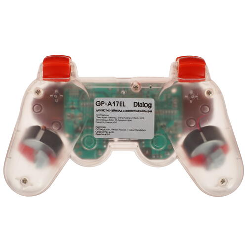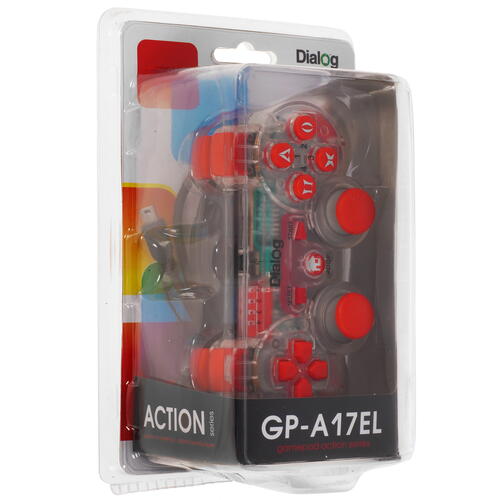 Панель управления представлена 14 кнопками, включая 2 контроллера осей и восьмипозиционный переключатель направления. Корпус джойстика выполнен из прозрачного пластика, что делает подсветку еще эффектнее. Два встроенных электромотора обеспечивают ощутимую виброотдачу при различных событиях. Геймпад Dialog GP-A17EL является универсальным манипулятором в играх любого типа и укомплектован CD-диском с программным обеспечением.