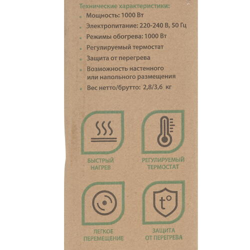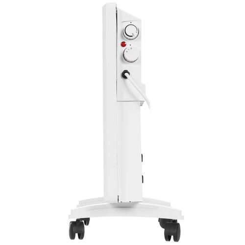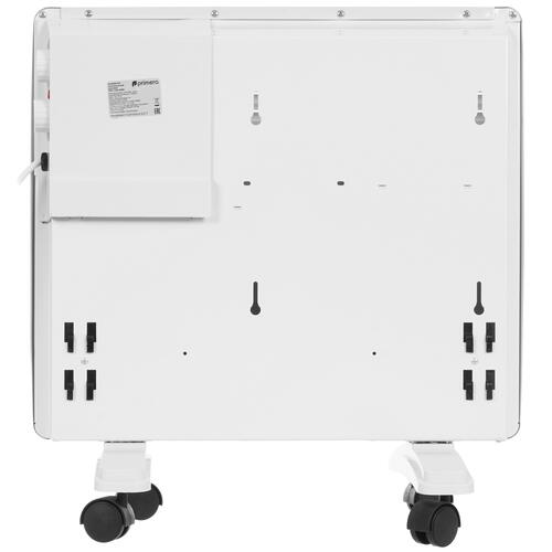 Конвектор Primera PHP-1000-MWB – компактный обогреватель с размерами 50.5x51x12 см, которому под силу обогревать комнату небольшой площади. «Сердцем» устройства стал монолитный (X-образный) нагревательный элемент с системой защиты от перегрева для продолжительного срока службы. На ножках-опорах присутствуют колесики, благодаря которым прибор удобно перемещать из одной комнаты в другую. На боковой стенке конвектора Primera PHP-1000-MWB присутствуют два поворотных регулятора для выбора ступени мощности (500 Вт или 1000 Вт) и настройки температуры обогрева. Обогреватель можно разместить не только на полу, но и на стене.
