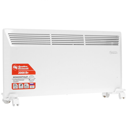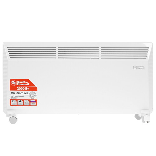 Конвектор QUATTRO ELEMENTI QE-2000KM с монолитным нагревательным элементом мощностью 2000 Вт обеспечивает высокую эффективность обогрева помещения. Он выполнен в металлическом корпусе с лаконичной белой расцветкой и оснащен простым управлением с поворотным механизмом. Благодаря регулируемому термостату обеспечивается выбор подходящего температурного режима. QUATTRO ELEMENTI QE-2000KM предусматривает два варианта установки – напольная за счет использования ножек-опор с маневренными колесами и настенный монтаж с помощью кронштейна.