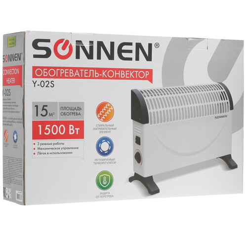 Конвектор SONNEN Y-02S предназначен для обогрева бытовых помещений или офиса площадью не более 15 м². Данная модель характеризуется игольчатым нагревательным элементом и тремя режимами интенсивности нагрева в пределах 1500 Вт, управляемыми с помощью поворотного переключателя. Конструкция передней панели способствует равномерному распределению теплового потока в пространстве помещения. Конвектор SONNEN Y-02S поставляется в наборе с пластиковыми опорами, обеспечивающими устойчивое размещение прибора на различных покрытиях.