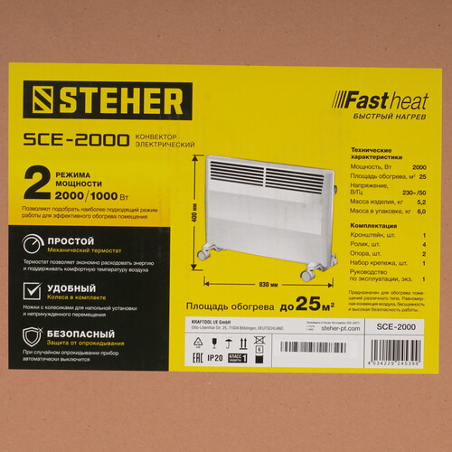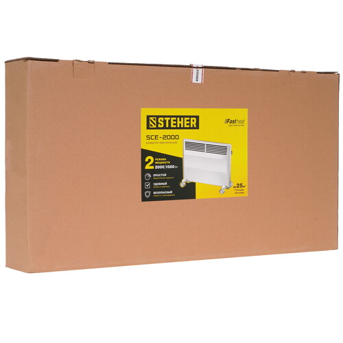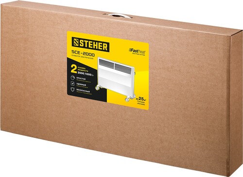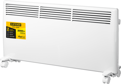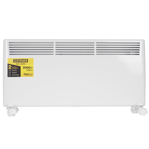 Электрический конвектор STEHER мощностью 2000 Вт станет надежным помощником в обогреве как жилых, так и офисных помещений площадью до 25 м². Он поддерживает два режима работы: на полной и половинной мощности, что позволяет экономить электроэнергию. Благодаря кронштейну для настенного крепления, который входит в комплект, конвектор можно установить в любом удобном месте. Защита от опрокидывания гарантирует безопасность во время использования. Нагревательный элемент СТИЧ обеспечивает моментальный нагрев и быстрое остывание, что позволяет быстро создавать комфортную атмосферу в помещении.