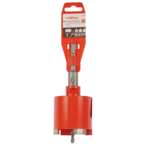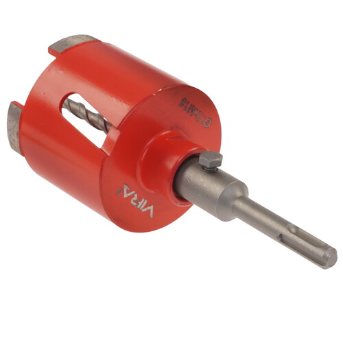 Алмазная коронка VIRA 559228 предназначена для сверления бетона, армированного бетона, кирпича, кирпичной кладки и силикатного кирпича с максимальным диаметром арматуры 22 мм. Оснащена сверхпрочными алмазными кристаллами для быстрого и качественного сверления и работает только в безударном режиме для дополнительной безопасности. Удобная фиксация центрирующего сверла обеспечивает точное сверление. При сухом сверлении важно учитывать нагрев и каждые 20-30 секунд охлаждения каждые 40-60 секунд. Рекомендуется использовать постоянное водяное охлаждение для повышения эффективности и долговечности коронки. Основные характеристики включают диаметр 72 мм и диаметр арматуры 22 мм, наличие компенсационных отверстий, сверхпрочные алмазные кристаллы, работу только в безударном режиме, комплект с держателем M16 и центрирующим сверлом M8, допустимые обороты до 900 об/мин и сухой тип сверления с ограничениями, указанными в инструкции.