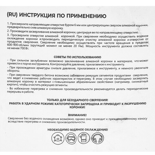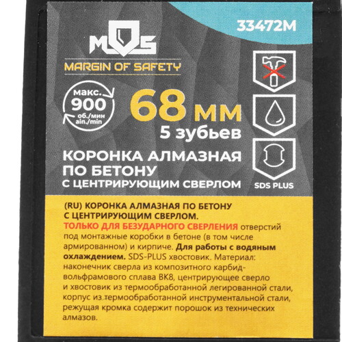 Коронка алмазная с центрирующим сверлом 8 мм и хвостовиком SDS-PLUS. Для безударного сверления отверстий под монтажные коробки в бетоне (в том числе армированном) и кирпиче. Для работы с водяным охлаждением. Материал: корпус из инструментальной стали, хвостовик и центрирующее сверло из легированной стали, наконечник сверла из карбида вольфрама, режущая кромка содержит порошок из технических алмазов. Упаковка: пластиковый подвес.