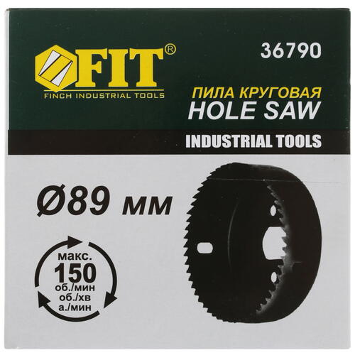 Коронка FIT 36790 представляет собой невысокий достаточно широкий цилиндр диаметром 89 мм. На одной из сторон этого цилиндра равномерно расположены острые зубья. Благодаря им осуществляется эффективная и быстрая обработка различных поверхностей из дерева мягких или твердых пород, а также ДСП. На другой стороне цилиндра предусмотрено отверстие, через которое происходит контакт круговой пилы и строительного оборудования. Пропил можно осуществлять на максимальную глубину 25 мм.