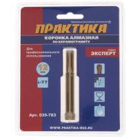 Коронка алмазная Практика 035-783 производится из углеродистой стали, дополненной вкраплениями синтетического алмаза. Такая конструкция способствует повышению износа и устойчивости к физическому воздействию. Данный элемент оснастки отлично подходит для работы с керамогранитом, камнем, кирпичом, стеклом и бетоном.