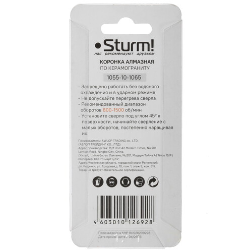 Sturm! 1055-10-1065 выполнена в корпусе с напаянными спеченными сегментами с содержанием промышленных алмазов. Кольцевое алмазное напыление позволяет коронке работать с хрупкими поверхностями. Коронка рассчитана на мокрое сверление с применением жидкости. При отсутствии смачивания водой изделие может перегреваться и разрушаться.