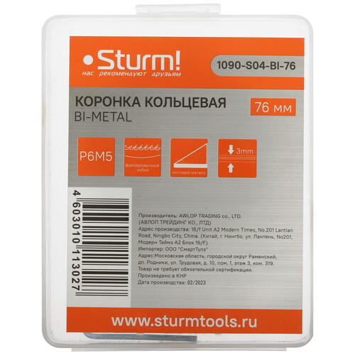 Sturm! 1090-S04-BI-76 позволяет получить круглое отверстие правильной формы. Внешне она напоминает стакан, по краям которого расположены зубцы. Они выполнены под углом, что позволяет получать ровный срез без заусенцев. В центре закреплено центрирующее сверло, что не позволяет коронке в процессе сверления смещаться. Функцию вентиляции режущей кромки выполняет пространство между зубцами. Через него наружу выходит сверлильная стружка.