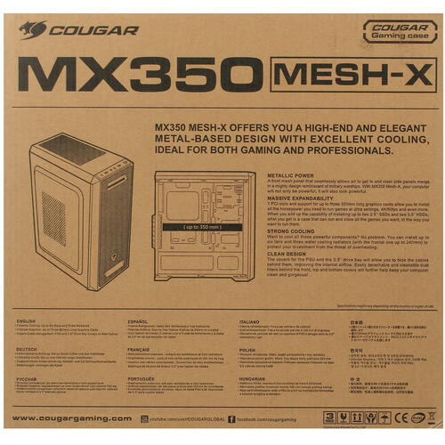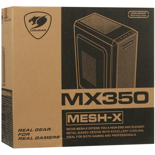 Корпус Cougar MX350 Mesh-X предназначен для размещения мощных игровых компьютеров. Он выполнен в стильном черном цвете и дополнен сетчатой передней панелью. Благодаря ей обеспечиваются хорошая вентиляция и охлаждение. Внутри корпуса имеется место для установки материнских плат формата Micro-ATX, Mini-ITX, Standard-ATX и длинных видеокарт до (35 см). Он также обладает возможностью размещения 2.5- и 3.5-дюймовых накопителей.