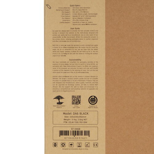 Корпус Streacom DA6 [ST-DA6B] с оформлением в черном цвете выполнен в форм-факторе открытого стенда и предназначен для постройки геймерского системного блока на базе вертикально расположенной материнской платы стандарта Mini-Itx. Благодаря открытому расположению всех элементов сборки такой корпус обеспечивает эффективный отвод тепла от теплонагруженных компонентов. Монтаж корпусных кулеров в этой модели не предусмотрен, но для охлаждения разогнанного процессора можно использовать эффективную СЖО.