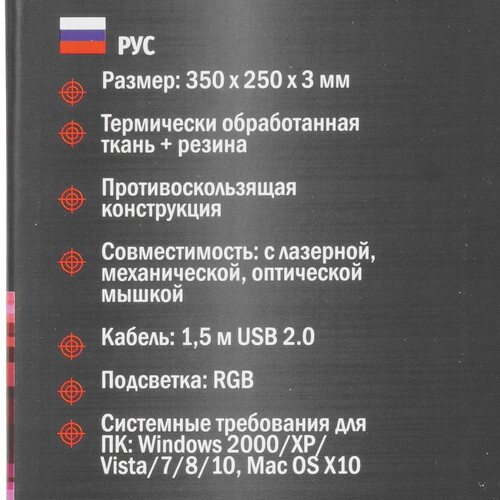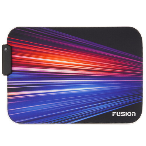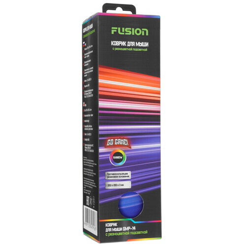 Коврик для мыши Fusion GMP-14 с рисунком на термически обработанной тканевой поверхности и противоскользящим резиновым основанием совместим с лазерной, механической и оптической мышкой. Коврик с RGB-подсветкой заряжается с помощью USB-кабеля длиной 1.5 м.