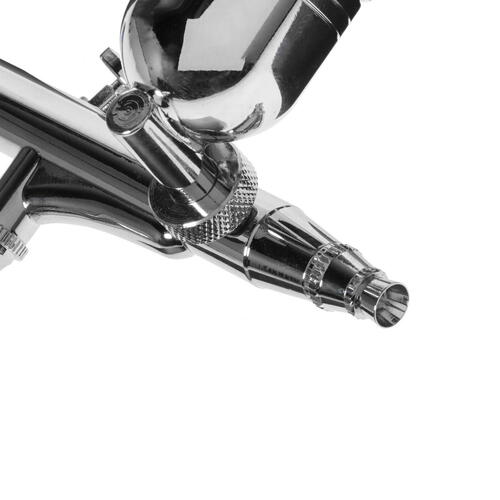 Аэрограф Concorde CD-AB7D подключается к компрессору посредством шланга с диаметром резьбы 1/8". Необходимо отметить, что максимальное давление, при котором допускается безопасная работа устройства, не должно превышать 3.5 Бар. Изготовленное из металла сопло обладает диаметром 3.5 Бар. Бачок с вместительностью 7 мл также изготовлен из сплава металлов, благодаря чему ему не страшны механические повреждения. Расход воздуха представленной модели соответствует 9 л/мин.