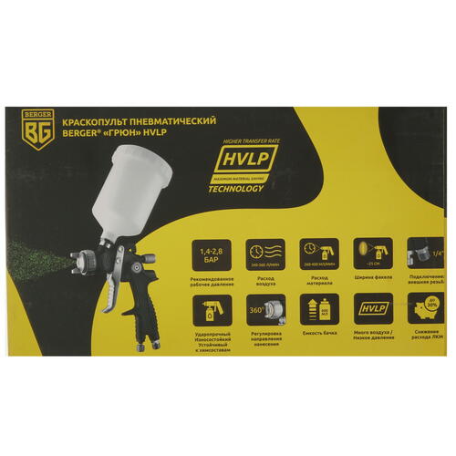 Краскораспылитель BERGER ГРЮН BG1377 – надежный, удобный и простой в уходе инструмент для работы с ЛКМ жидкой вязкости. Прибор оснащен верхним пластиковым баком на 600 мл и металлическим соплом 1.4 мм. Устройство работает с давлением 2.8 бар и расходом воздуха 360 л/мин.