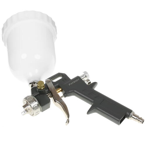Пневматический краскораспылитель PATRIOT LV 162A, относящийся к типу LVLP, подключается к источнику сжатого воздуха с использованием быстросъемного соединения. 500-миллилитровый бачок установлен сверху. Для распыления используется 1.5-миллиметровое сопло. Инструмент допускает регулировку формы струи.