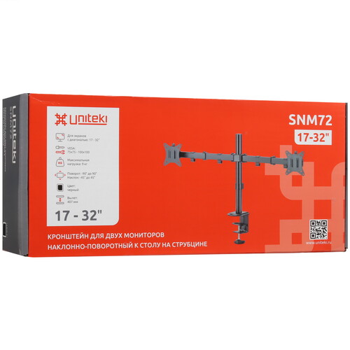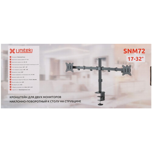 Кронштейн UNITEKI SNM72 не оставит никого равнодушным, не только потому, что он подходит для всех мониторов, диагональю от 17 до 32 дюймов (см.: 43 ~ 81) и весом до 9 кг., но и потому, что позволяет легко и просто передвигать мониторы в любых плоскостях. Поворачивайте мониторы на 180 градусов, наклоняйте вверх и вниз, всё это может наш кронштейн UNITEKI SNM72. Наклонно-поворотный кронштейн-крепление со струбциной UNITEKI SNM72 отвечает высочайшим стандартам качества.