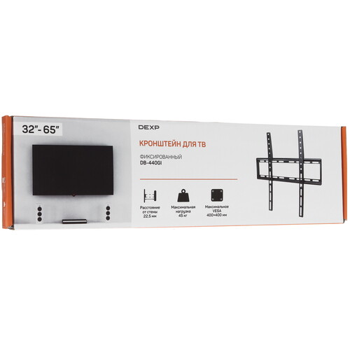 У кронштейна ТВ DEXP DB-440GI предусмотрено 2 регулировочных колена, благодаря которым точнее и проще настраивается положение ответной части. Дополнительно можно корректировать расстояние до стены или потолка 22.5 мм. Устройство выдерживает телевизоры весом до 45 кг, а диагональ экрана ТВ должна быть в пределах 32-65".