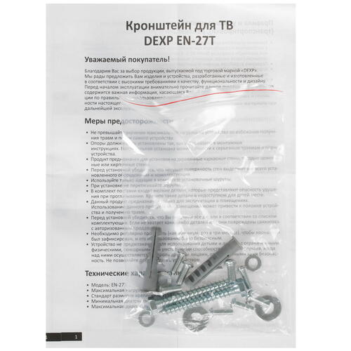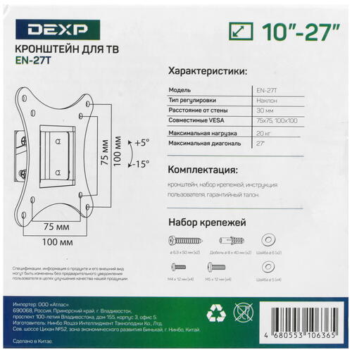 Кронштейн DEXP EN-27T допускает регулировку наклона. Диапазон регулировки – от 5° вверх до 15° вниз. Цвет изделия традиционный – черный. В комплектацию кронштейна входит набор крепежа. Есть в комплекте и инструкция. Срок эксплуатации кронштейна не ограничивается. Информация о характеристиках аксессуара размещена на упаковке.