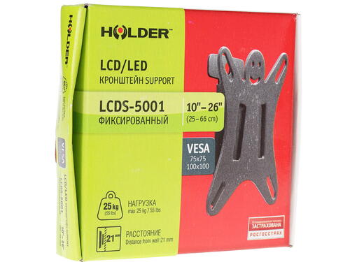 Крепление для ТВ и мониторов Holder LCDS-5001 с фиксированной возможностью крепления настенных телевизоров и мониторов весом не более 25 кг. Стандарты размеров VESA этого кронштейна различаются: от 75х75 до 100х100 мм. Возможные диагонали экранов – от 10 до 26 дюймов. Расстояние от стены не регулируется и составляет 21 мм.