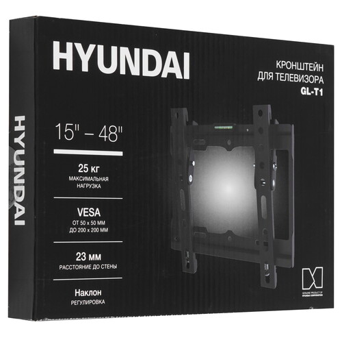 Кронштейн Hyundai GL-T1 плотно фиксируется на поверхности. Он выдерживает нагрузку до 25 кг. Расстояние от стены не меняется и составляет 23 мм. Стальная конструкция с окрашенным покрытием черного цвета гарантирует устойчивость к деформации и механическим воздействиям.