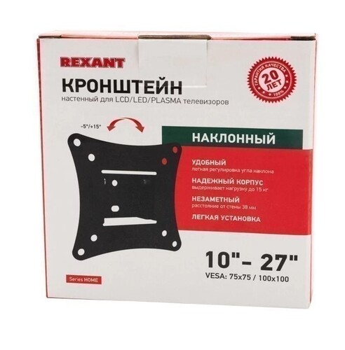 Кронштейн Rexant 38-0305 используется для крепления LED, LCD, PLASMA телевизоров 13"-37" дюймов к стене. Устройство оснащено наклонным механизмом, который позволяет регулировать положение телевизора относительно вертикальной оси (угол наклона: -5°/+15°).