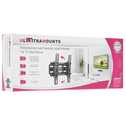 Настенный кронштейн для ТВ Ultramounts UM836T черного цвета совместим с телевизорами, диагональ экрана которых составляет от 17 до 43 дюймов. Аксессуар рассчитан на нагрузку не более 35 кг. В модели реализована функция наклона до 5° вверх и до 10° вниз. Расстояние от стены фиксированное – 50 мм. Кронштейн для ТВ Ultramounts UM836T совместим с креплениями VESA 100x100, 200x100, 200x200 и 75x75.