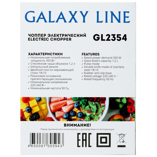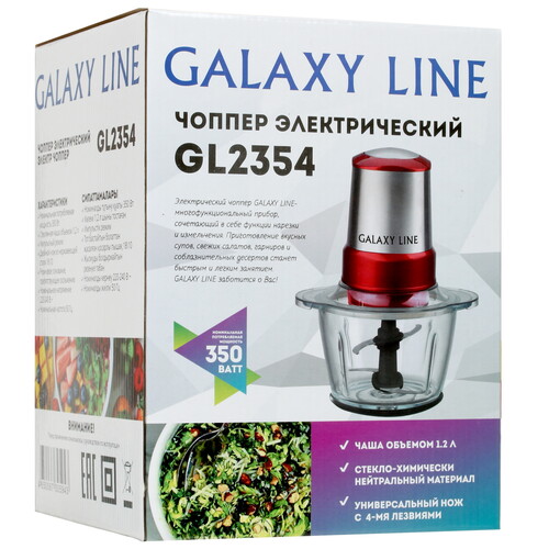 Измельчитель Galaxy Line GL2354 с питанием от электросети станет востребованным помощником в приготовлении различных салатов или других блюд. С его помощью вы сможете быстро и качественно измельчать продукты различной твердости. Измельчитель оборудован одним скоростным режимом с простым управлением на моторном блоке и прозрачной стеклянной чашей, которая обладает емкостью 1.2 л. Универсальный нож с 4-мя стальными лезвиями отличается высокой эффективностью измельчения и рассчитан на длительный срок службы. Верхняя крышка исключает разбрызгивание содержимого. Прорезиненное основание прочно фиксирует прибор Galaxy Line GL2354 на поверхности, предотвращая проскальзывание.