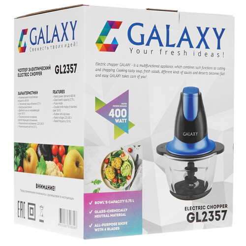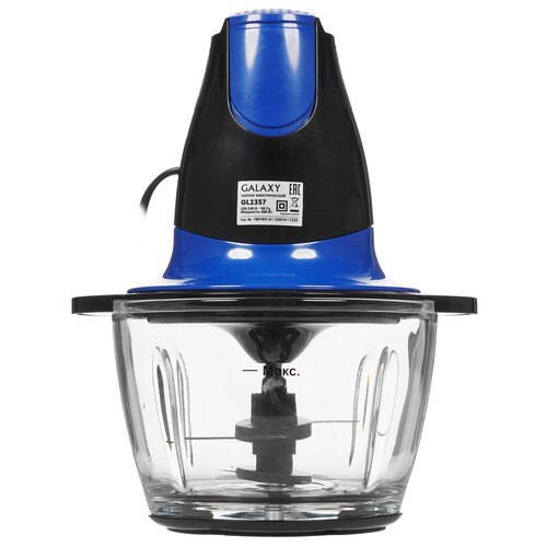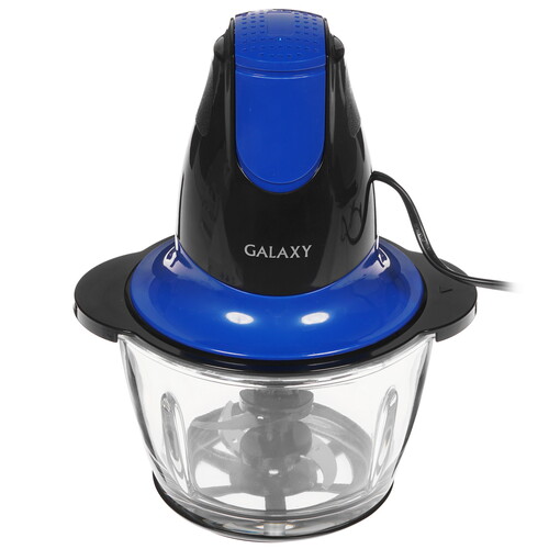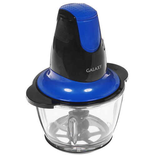 Измельчитель Galaxy GL2357 представлен в черном пластиковом корпусе с яркими синими элементами и эргономичной ручкой. Устройство дополнено прозрачной стеклянной чашей на 750 мл. Работа осуществляется с мощностью 400 Вт при наличии одной скорости и эффективного импульсного режима.