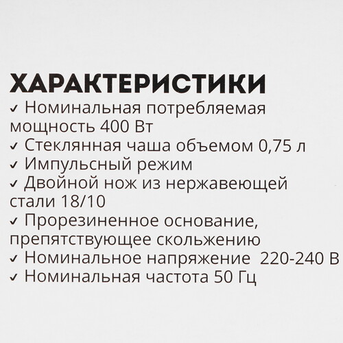 400 Вт, чаша - 750 мл, скоростей - 1 шт, корпус - пластик, импульсный режим