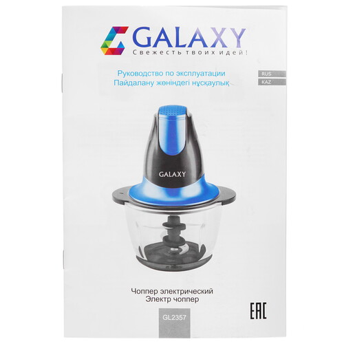 В основе прибора Galaxy GL2357 используется универсальный двойной нож для измельчения разных продуктов. Конструкция дополнена устойчивыми прорезиненными ножками. Размеры прибора составляют всего 20x22x15 см, что позволяет хранить его в небольшой кухонной тумбе.