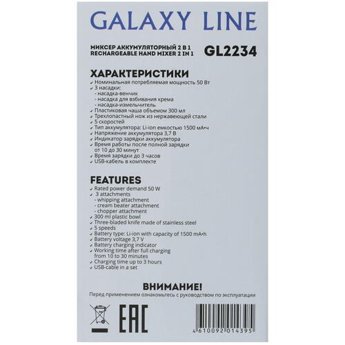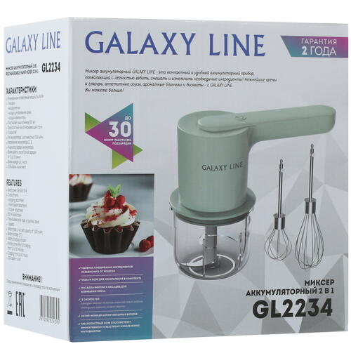 Измельчитель Galaxy Line GL2234 поставляется в наборе с тремя сменными насадками – венчик для взбивания, специальная насадка для приготовления пышного однородного крема и измельчитель для продуктов. Одним из преимуществ прибора Galaxy Line GL2234 является независимая от электросети работа на основе встроенного аккумулятора, который гарантирует в пределах 30 минут автономности. Благодаря 5-ти скоростным режимам можно плавно настраивать подходящую интенсивность. Пластиковая чаша обладает емкостью 300 мл и легко очищается от загрязнений.