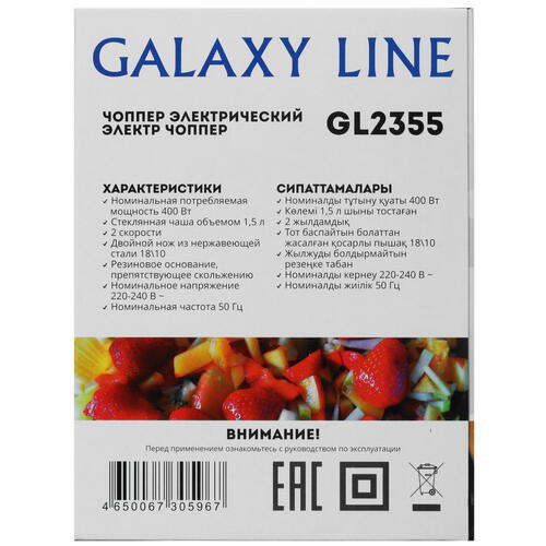 Измельчитель Galaxy Line GL2355 поможет быстро и качественно измельчать самые разные продукты, облегчая процесс приготовления пищи. Высокая эффективность измельчения и смешивания обеспечивается благодаря универсальному ножу с 4-мя стальными лезвиями. Данная модель оснащена двумя скоростными режимами и широкими кнопками управления для регулировки. Стеклянная прозрачная чаша не впитывает запахи, устойчива к повреждениям и легко очищается от загрязнений. Емкость чаши составляет 1.5 л. Для удобного перемещения предусмотрены ручки с боковых сторон. Верхняя крышка исключает разбрызгивание содержимого. А прорезиненное основание предотвращает проскальзывание Galaxy Line GL2355 на поверхности.