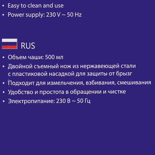 500 Вт, чаша - 500 мл, скоростей - 1 шт, корпус - пластик