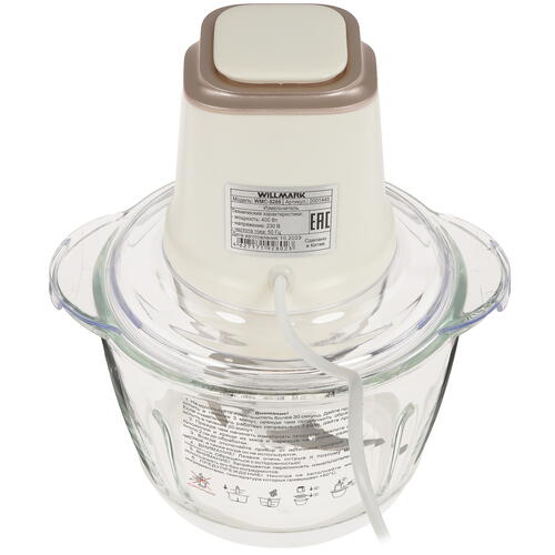 Измельчитель Willmark WMC-5288 представлен в бежевом пластиковом корпусе с удобной кнопкой включения/отключения. Прорезиненная накладка не дает устройству скользить по гладкому кухонному столу. Стеклянная чаша помогает соблюдать пропорции и визуально контролировать процесс работы.