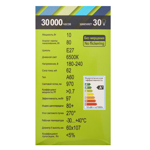 E27, 10 Вт, 970 лм, 6500 K, 180-240 В / 50 Гц, в комплекте: 1 шт