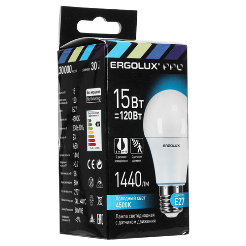 Лампа светодиодная Ergolux LED-A60P-15W-E27-4K PRO излучает нейтральный белый свет с температурой 4500 K и высоким индексом цветопередачи 80 Ra. Она подходит для установки в приборы с цоколем стандарта E27. Благодаря датчику движения лампа автоматически включается при обнаружении движения в темноте и отключается через 30 секунд, если движение прекращается. Матовая поверхность на колбе обеспечивает мягкое и равномерное распределение света в пространстве помещения. Срок службы лампы Ergolux LED-A60P-15W-E27-4K PRO составляет 30000 часов.